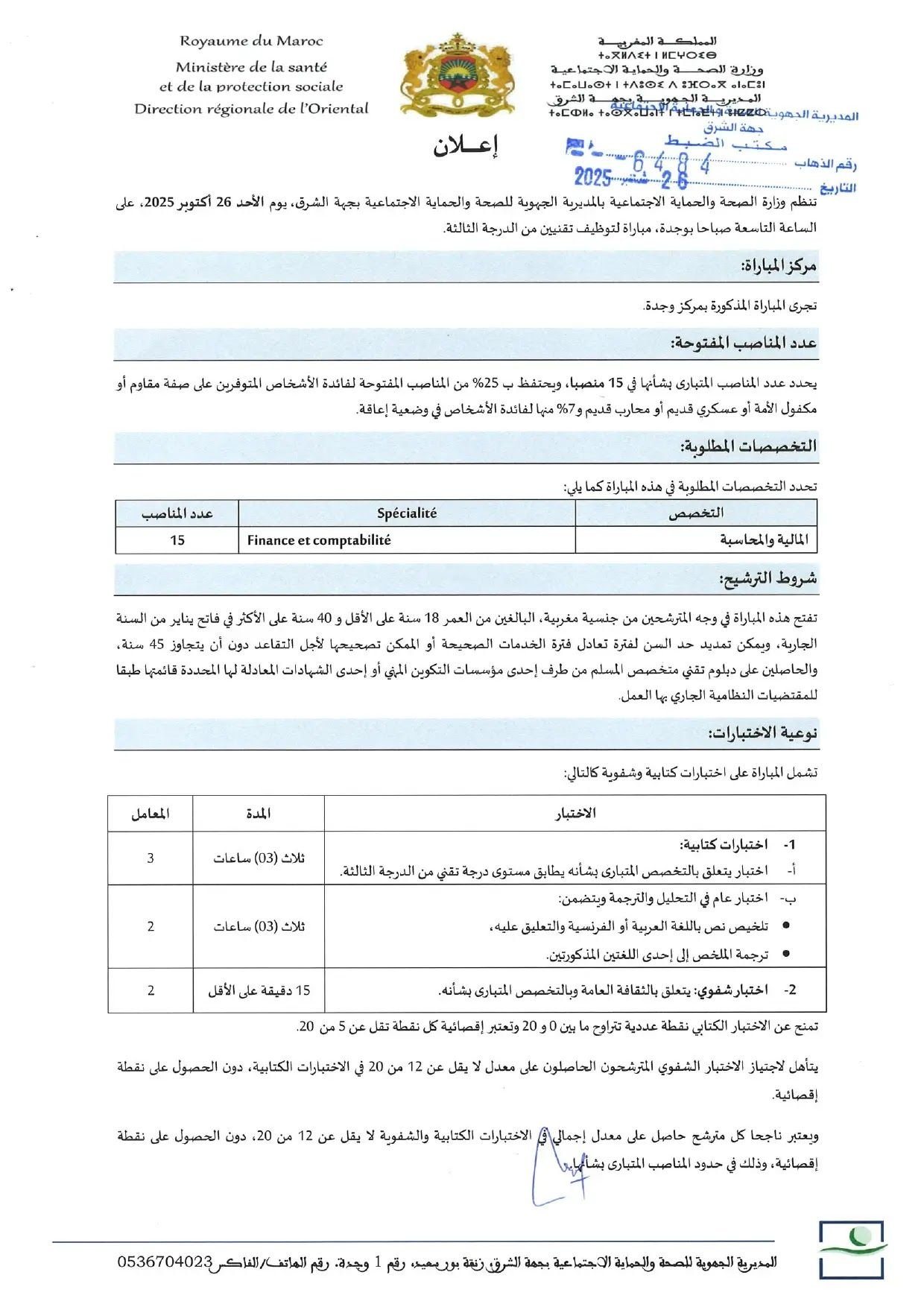 أعلنت وزارة الصحة والحماية الاجتماعية – المديرية الجهوية لجهة الشرق عن تنظيم مباراة لتوظيف تقنيين من الدرجة الثالثة، وذلك يوم الأحد 26 أكتوبر 2025 على الساعة التاسعة صباحاً بوجدة.